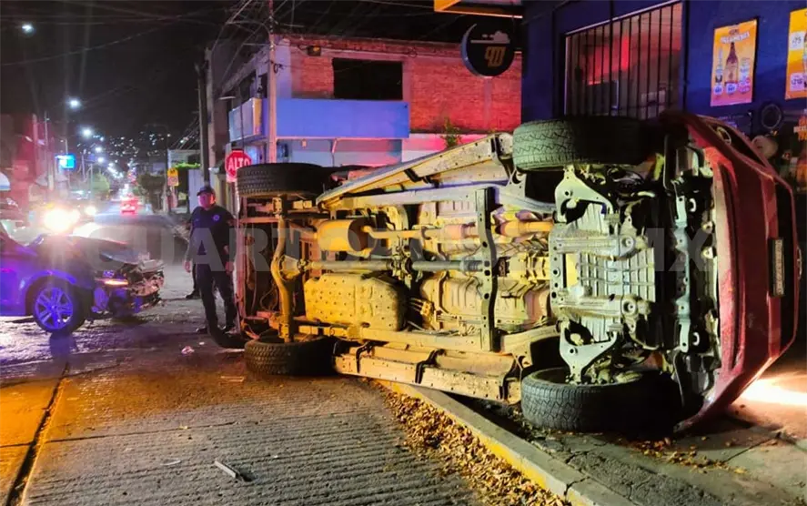 Asimismo, se indicó que el accidente se produjo por un presunto corte de circulación, por lo que la camioneta tras recibir el impacto terminó volcando sobre la banqueta, averiada severamente de la góndola, y el automóvil destrozado de la parte frontal sobre sus llantas.