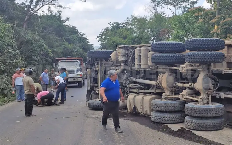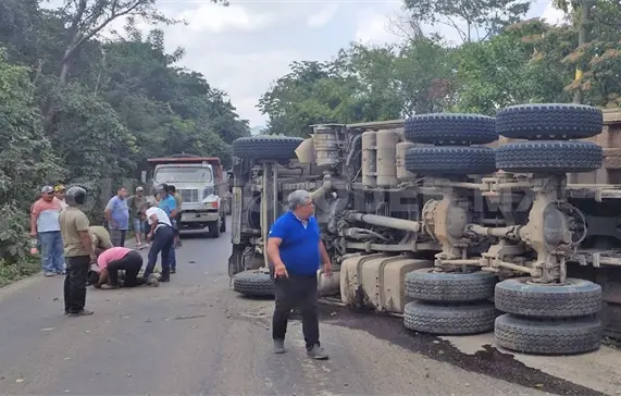 Daños materiales y un lesionado fueron el saldo de la volcadura de un camión militar que iba cargado con material pétreo, en hechos ocurridos durante la tarde del sábado en la ciudad de Palenque.