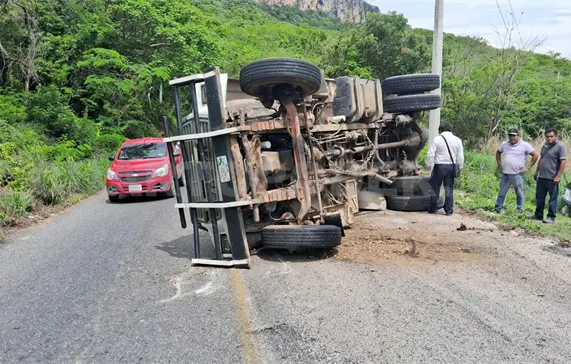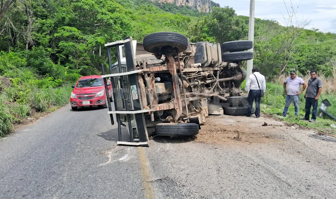 Sobre la vía Suchiapa a El Jobo, cerca de la ranchería Los Tres Potrillos, un camión de volteo acabó volcando tras perder el control en una curva pronunciada.