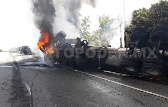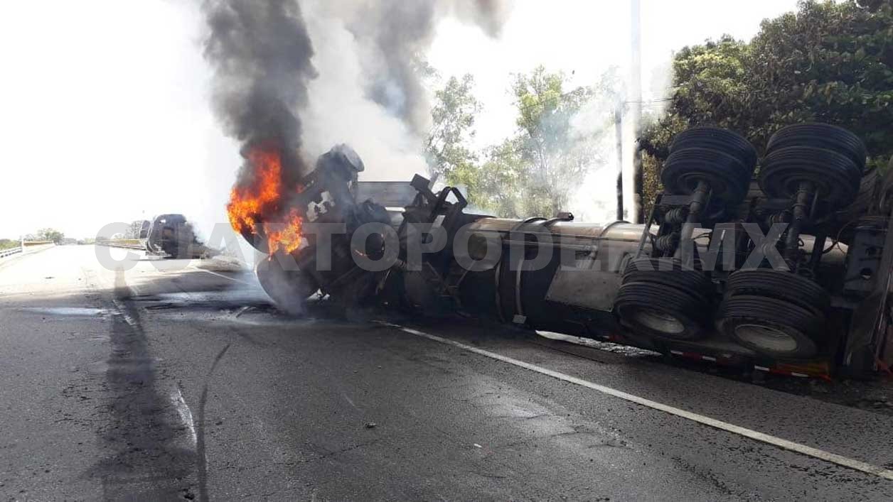 Un tráiler que jalaba dos pipas, cargadas con 32 mil litros de diésel cada una volcó, incendiándose una de ellas a pocos metros del puente Vado Ancho, El percance mantuvo cerrada la circulación.